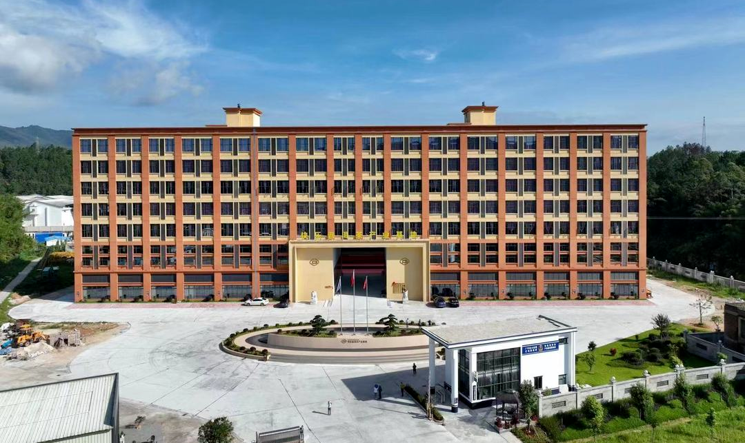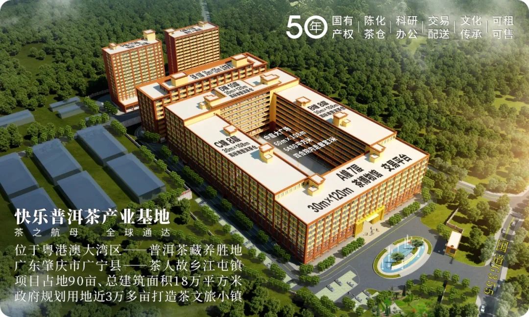 快乐普洱茶产业基地2020年立项兴建,位于粤港澳大湾区后花园、茶人故乡肇庆市广宁县江屯镇,首期占地90亩,总规划建筑面积约18万平方米,以A、B、C、D四幢组成四合院,首期A幢2.5万平方米已于2022年5月21日正式投入使用。