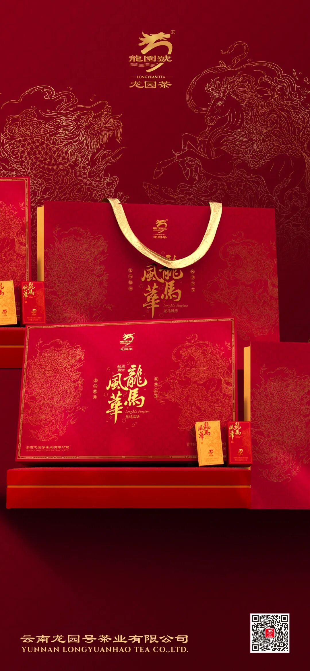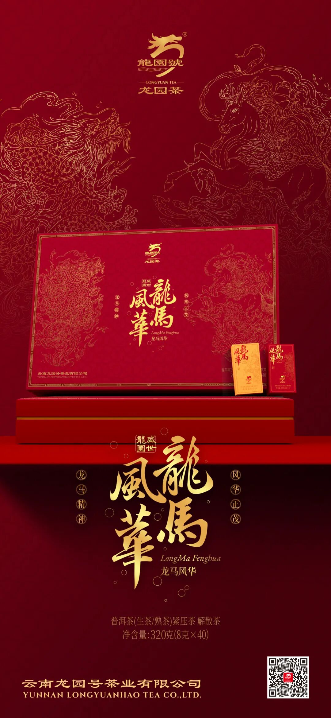 【龙马风华】普洱茶系龙园号新推出的一款十年陈普洱生熟套装礼茶。采用中华民族传统“龙腾马跃”元素为设计理念。「龙马」取自《周易》「河出图,洛出书,圣人则之」之神兽,象征天地精神与祥瑞之气;「风华」既喻茶叶历经岁月淬炼仍葆华彩,亦暗合「风华正茂」的生命力。此名尽显茶品雍容气度与陈化潜力,寓示品饮者如龙跃云津、骏驰寰宇。