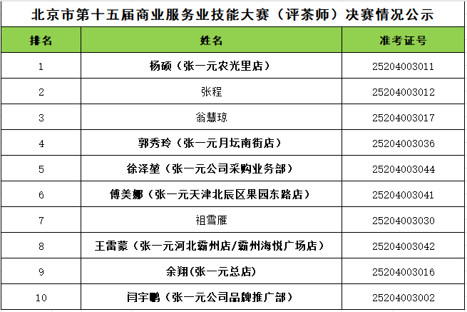 2025年10月18日,由北京市商务局、北京市人力资源和社会保障局、北京市总工会、北京市妇女联合会、共青团北京市委共同主办的北京市第十五届商业服务业技能大赛评茶师竞赛决赛项目完美收官,张一元公司选手取得第一名的好成绩,在前十名中独占7席。