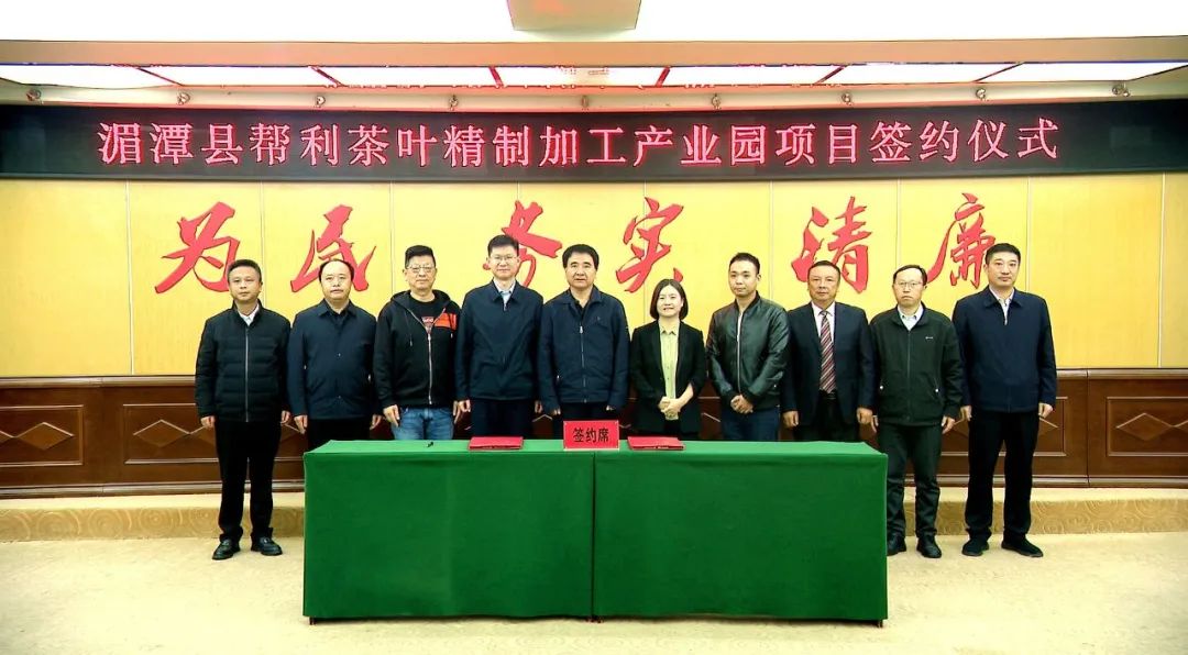11月28日,湄潭县与福建帮利茶业有限公司举行湄潭县帮利茶叶精制加工产业园项目签约仪式。县委书记游海燕,县委副书记、代理县长张如仲,中国茶叶流通协会副会长、福建帮利茶业有限公司董事长张朝斌,福建帮利茶业有限公司副总经理李澍,中国茶叶流通协会茶咖委副主任委员张兴,县委副书记侯廷胤,县领导龙卫东、徐才忠、陈胜、周洁,福建帮利茶业有限公司及湄潭县直相关部门负责同志出席。